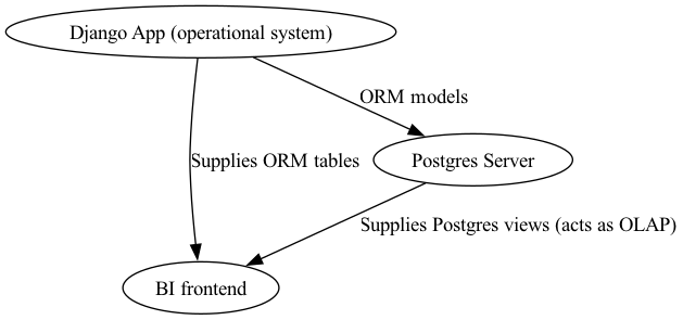 Note that I only separate the Django App and BI frontend on the diagram for conceptual clarity. However the BI frontend is a Django View accesible with a specific url such as `www.app.client.com/dashboard/sales-yearly`.