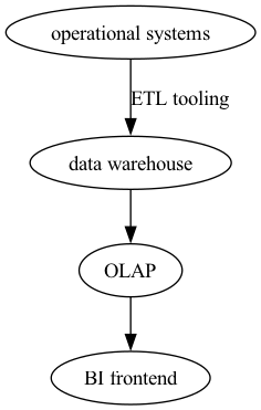 This approach assumes that there is a seperation between the operational system, or online transaction processing (OLTP) and the online analitical processing (OLAP). This means that there are at least two databases and one transformation process that has the OLTP as input and OLAP as output.